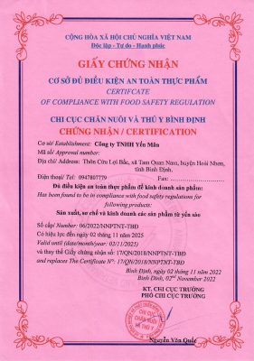 Các sản phẩm Yến hủ Yến chưng đường phèn rừng, Yến chưng đường phèn đông trùng hạ thảo, Yến chưng đường phèn saffron. Với phương châm chữ tín tạo thương hiệu, công ty đã mang đến người tiêu dùng những sản phẩm chất lượng đáp ứng đủ điều kiện sức khỏe người tiêu dùng, đã được chi cục thú y bình định cấp giấy chứng nhận, cơ sở đủ điều kiện an toàn vệ sinh thực phẩm, công ty xây dựng hệ thống quản lý và cấp chứng nhận ISO 22000-2018, ngoài ra công ty xây dựng truy xuất nguồn gốc sản phẩm yến sào từ trại nuôi đến sản xuất. Các sản phẩm công ty đạt ocop 3 sao năm 2023.